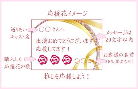 キャストへのメッセージを劇場に掲示。文字は20文字以内。特典として、キャストの公演オリジナルブロマイド付。ランダムでのお渡しです。特典へのキャストのサイン、郵送は可。